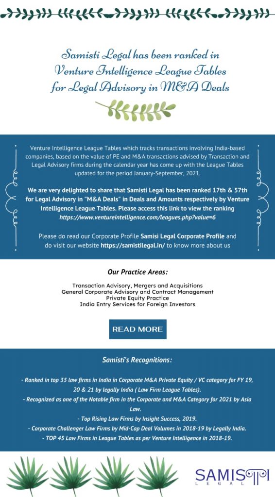 Home News & Events Samisti Legal has been ranked 17th & 57th for Legal Advisory in “M&A Deals” in Deals and Amounts respectively by Venture Intelligence League Tables.