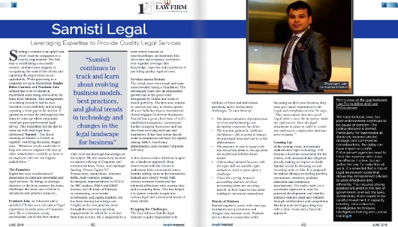 Insights Success, a Business Solutions magazine having global readership has come out with its special edition in June, 2019 where it has covered the ‘Ten Rising Law Firms to watch in 2019’. We are happy to report that Samisti Legal has been featured as one among them.